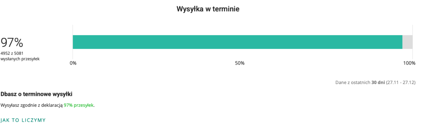 W tym przypadku najważniejszą miarą, która powie nam czy utrzymamy oznaczenie jak najdłużej jest Wysyłka w terminie. Jeśli w tym miejscu mamy wskaźnik na poziomie 95% lub więcej - nie mamy się o co martwić.