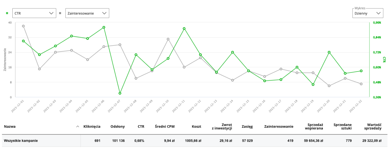 Średni CTR 3,63% co również udowadnia, że Kupujący chętnie wchodził w interakcję z reklamą i wybierał Naszą ofertę.